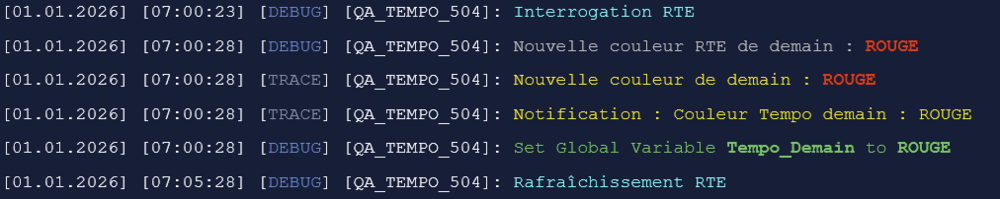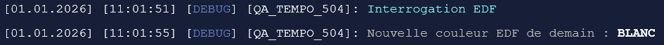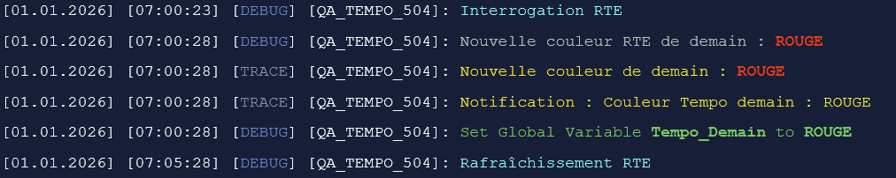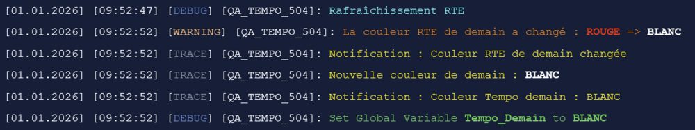 (préambule : j'étais en train d'écrire ce message quand j'ai eu la notification de ton message ) Effectivement, et c'est première fois que ça arrive depuis que j'ai écris ce QuickApp, la couleur du jour annoncée pour demain 2 janvier a changé entre les premières estimations à 7h du matin et l'annonce officielle par EDF à 11h. J'avais prévu le coup dans mon script, car l'annonce officielle c'est toujours celle de 11h, publiée par EDF. Quand on va chercher les infos par anticipation le matin, ça peut changer... bah c'est finalement arrivé ! On s'en sort bien, ça aurait dû être rouge, finalement c'est repassé en blanc à 9h50. Le log en couleur :