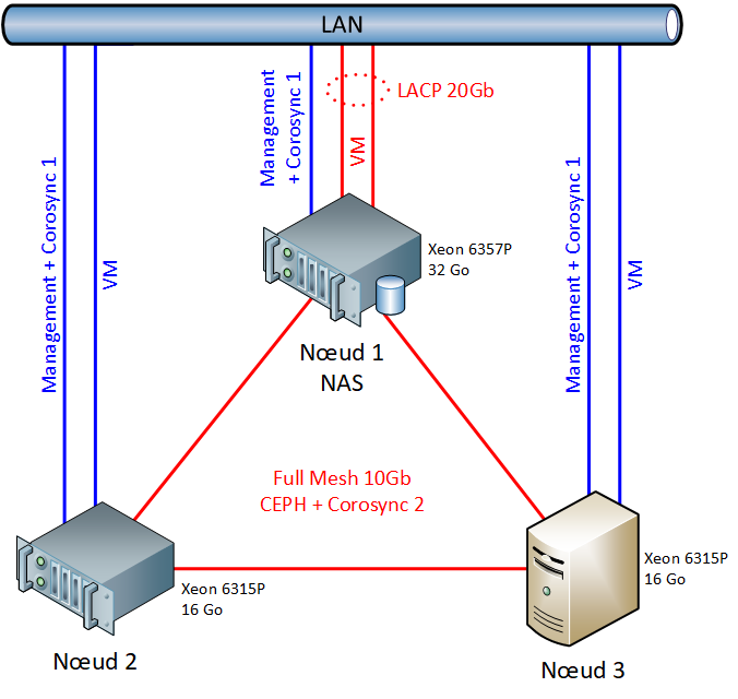 Architecture matérielle Configuration des nœuds du cluster Les 3 nœuds n'auront pas la même configuration matérielle, même si l'architecture sera la même afin de permettre une migration des VM et applications entre chacun des 3 nœuds. A ce sujet, il est essentiel d'utiliser des processeurs de la même famille (= même jeu d'instructions) afin de permettre aux VM qui s'exécutent sur un noeud de pouvoir migrer à chaud d'un serveur à un autre. Sans cela, la migration à chaud est impossible et doit se faire à froid, afin qu'au redémarrage la VM découvre le jeu d'instruction du serveur cible et s'adapte en conséquence. Comme mon cahier des charges est de monter une infrastructure la plus résiliente possible, j'ai fait le choix de m'orienter vers des composants "professionnels", à savoir pas des produits issus du monde grand public qu'on trouve dans les PC classiques. Je sais que plein de personnes montent des serveurs avec des composants grands publics et que ça fonctionne très bien, mais quand on creuse le sujet (sur les forums spécialisés Reddit, etc) on s'aperçoit qu'il y a toujours un moment où c'est instable, ça plante, ou bien qu'il faut remplacer un composant de manière prématurée. Je le disais, je cible au moins 15 ans de durée de vie pour ce système, pas question que ça lâche avant. En réalité, dans le langage marketing moderne, ce n'est pas le terme "pro" que je devrais utiliser, mais "entreprise". Tant pis pour l'abus de langage. Surtout, j'ai besoin de certaines caractéristiques des composants pro pour le bon fonctionnement de mon système. En vrac : une interface IPMI sur la carte mère pour la gestion à distance (équivalent ILO, iDRAC, IMM2, etc) de la RAM ECC pour la correction d'erreur, particulièrement pour TrueNAS qui utilise massivement la RAM comme cache disque pour les performances des SSD avec PLP intégré (Power Loss Protection), totalement indispensable pour CEPH une connectivité réseau 10 Gb/s pour la réplication CEPH J'ai longtemps voulu partir sur des processeurs AMD EPYC 4005 Grado (architecture Xen5), cependant j'ai renoncé à cause de la consommation élevée au repos (en idle) de ces processeurs. Je suis donc revenu au classique choix Intel Xeon 6, qui permet des optimisations poussées pour descendre assez bas. Il s'agit avant tout d'un homelab, qui aura une très faible activité la majeure partie du temps, donc j'ai privilégié le choix raisonnable de la consommation électrique réduite. C'est dommage d'un point de vue performance, car pour le même prix on a quasiment 2 fois plus de performances chez AMD, de son coté Intel est clairement à la traine. Le 1er nœud, qui portera la VM TrueNAS, sera le mieux équipé. Les 2 autres nœuds seront moins richement dotés, ce qui permet de réduire la facture d'achat, et déjà plus que suffisant pour mes besoins actuels (et même surdimensionné...). Mais si le besoin s'en fait sentir plus tard, je pourrai toujours faire évoluer leur configuration (ajout de RAM, stockage, etc... voire remplacement du CPU). Nœud n°1 : NAS Gros boitier rackable 19" Gros CPU RAM 32 Go Carte SAS pour connecter tous les disques durs Nœud n°2 Petit boitier rackable 19" Petit CPU RAM 16 Go Nœud n°3 Boitier Mini-ITX Petit CPU RAM 16 Go Comme on le constate, les 2 premiers nœuds seront en boiter rackables 19", destinés à être installés à la cave dans un futur rack à venir. Tandis que le 3ème nœud dans un boitier compact au format Mini-ITX, l'objectif étant de le déporter au rez-de-chaussée, dans le placard qui héberge actuellement mon Micro-serveur Gen8. En effet, j'ai besoin d'y connecter une antenne EnOcean en USB car j'ai encore quelques modules utilisant ce protocole. Demain, si je déploie du Home Assistant, je pourrai également y connecter une antenne Z-Wave, Zigbee, Thread, Whatever... sauf si j'utilise une antenne déportée Ethernet POE, mais en tout cas je en serai pas embêté par la portée radio. Réseau Chaque carte mère dispose de 2 connexions 1 Gbit/s sur ports RJ45. Je vais ajouter en plus une carte d’extension PCIe à 10 Gbit/s sur chaque nœud, avec slot SFP afin d'y brancher des câbles DAC. J'ai déjà expliqué que j'évite le 10 Gb sur port RJ45 à cause de la consommation et donc de la chauffe très importante. L'utilisation de câbles DAC est bien plus efficient d'un point de vue énergétique, mais aussi financier (si le câble DAC coute plus cher que le câble RJ45 Cat 6a, le gros gain se fait sur le coût des ports coté serveur et coté switch). En plus, le câble DAC est la solution présentant la plus faible latence, et cet aspect est particulièrement important pour les performances de mon réseau de réplication CEPH, car chaque écriture d'une VM sur un nœud ne sera acquitté que lorsque l'ensemble des 3 nœuds auront validé l'écriture sur leur SSD local. J'ai même pensé à utiliser du 25 Gbit/s, pas tant pour le débit, que pour la latence encore plus faible, mais d'une part je n'ai pas trouvé de prix intéressant, et d'autre part ça aurait augmenté la consommation électrique. On verra dans le futur si l'utilisation de 25G s'avère nécessaire, je pourrai toujours remplacer les cartes PCIe. Pour économiser un peu, et puisque je n'ai pas besoin de 10G pour les VM des nœuds 2 et 3, celles-ci utiliseront le réseau 1G pour la connectivité externe. Le nœud TrueNAS, lui, a besoin de connectivité rapide pour les échanges de gros fichiers, donc du 10G pour ne plus être bridé par ma connexion interne fibrée de 8 Gbit/s (même si je suis bridé à 5 Gbit/s réels par mon routeur avec IDS/IPS activité) Donc pour chaque nœud, j'ajoute la carte 10G suivante : Nœud n°1 : 4 x 10 Gbit/s Nœud n°2 : 2 x 10 Gbit/s Nœud n°3 : 2 x 10 Gbit/s Le réseau CEPH entre les 3 nœuds sera de type Full Mesh, c'est à dire que chaque nœud communique avec son voisin en connexion directe point à point, sans passer par les switchs. Cette archi