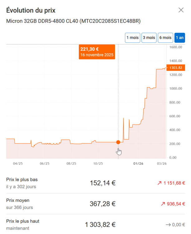 En boitiers, Silverstone c'est le top qualité, avec un choix incroyable de modèles rackable ou tour, certains sont même montables dans les 2 configurations. Comme tu dis, le vrai problème c'est la RAM, regarde l'évolution du prix des barrettes que j'utilise, sachant que j'en ai 4 des comme ça; j'ai mis le curseur au moment où je les ai acheté : Fait attention, il faut vérifier, mais j'ai peur que partir sur du Xeon risque de t'imposer de la RAM ECC, et avec les prix actuels, ce n'est plus possible. A ta place, je choisirais en premier la RAM, et en fonction de ce que tu trouves, tu montes le serveur autour. Donc après la RAM, tu choisi la carte mère, processeur, etc... peut être qu'au final ça ne sera pas de Xeon mais du Core quelque chose, avec un socket différent de LGA1700. En plus, si la consommation est importante pour toi, un Core descendra plus bas qu'un Xeon (gamme pro, optimisé pour la perf...) Attention aux SSD aussi qui ont déjà méchamment augmenté, c'est pour ça que j'avais fait un peu de stock avec mes 20 To de SSD..... Il t'en faut au moins un pour le disque de boot et le datastore des VM. Pour Surveillance Station, après des mois de réflexion j'ai trouvé comment je vais faire : - dans un 1er temps, monter une VM Xpenology dédiée exclusivement à Surveillance Station (équivalent à ce que j'ai actuellement sur mon HP Gen8 en fait) - dans un second temps (l'année prochaine ?) : tout basculer en Unifi, ce qui implique d'acheter un NVR de la marque (surement le modèle UNVR), mais aussi leurs caméras (la gamme G6 est top) De toute façon aujourd'hui, Synology s'est endormi sur ses lauriers. Plus d'évolution de Surveillance Station, tandis que Unifi avance à une vitesse folle, quand tu vois l'interface et les capacités d'IA, ça dépasse déjà Syno. Mais l’investissent financier initial est assez important. Avec la pénurie des composants, c'est pas le bon moment pour se monter une nouvelle machine, tu t'y prends au mauvais moment (mais ça sera encore pire dans quelques mois....) Sinon, j'ai reçu mon Xeon, je peux commencer à monter le nœud principal ce week-end