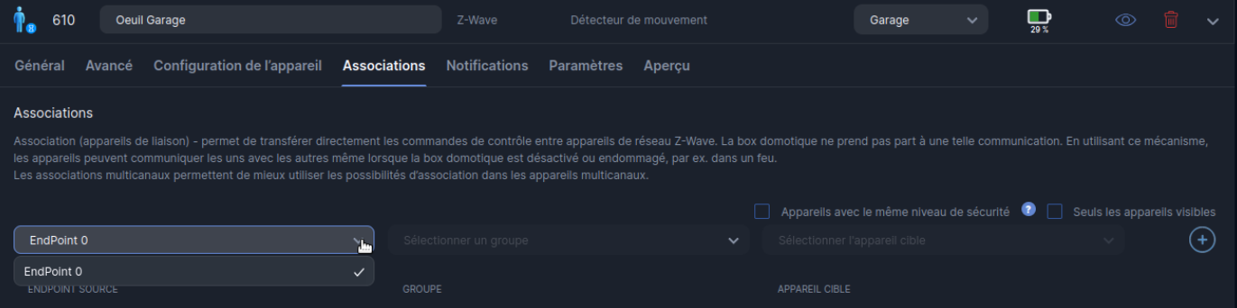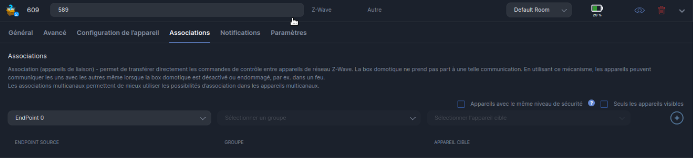 Franco268 Posté(e) jeudi à 15:37 Signaler Posté(e) jeudi à 15:37 Hello, J'ai un petit problème sur ma domotique qui m'a conduit à un autre.... J'ai un capteur "œil" neocam que j'utilise pour détecté une présente et allumer une lumière derrière un Qubino dimmer sur rail DIN qui pilote un relais alimentant 3 néon LED. Depuis 5 jours, je constate que: dès que la lumière s'éteint après 4 minutes (paramètre 2 = 240 du neocam), le neocam redétecte une présence et rallume la lumière, et ceci quasi en boucle. Si vous avez une idée, je suis preneur... Ce qui m'amène au second sujet... J'ai cherché comment était pilotée la lumière (installation trop ancienne pour moi, je ne m'en souvenais plus) et là... surprise, pas de scène.. pas de QA... et pas d'association... Je me suis dit que pour une application du genre, pourquoi serais je passé par la HC3? Alors, je fouille les associations! HC3: via API: Est ce moi qui ne comprend pas ce que j'ai sous les yeux? Dans un cas, on ne voit pas d'association et dans l'autre on voit bien l'association avec "100" ? non? Si vous arrivez à éclairer ma lanterne sur les 2 sujets, je suis preneur.